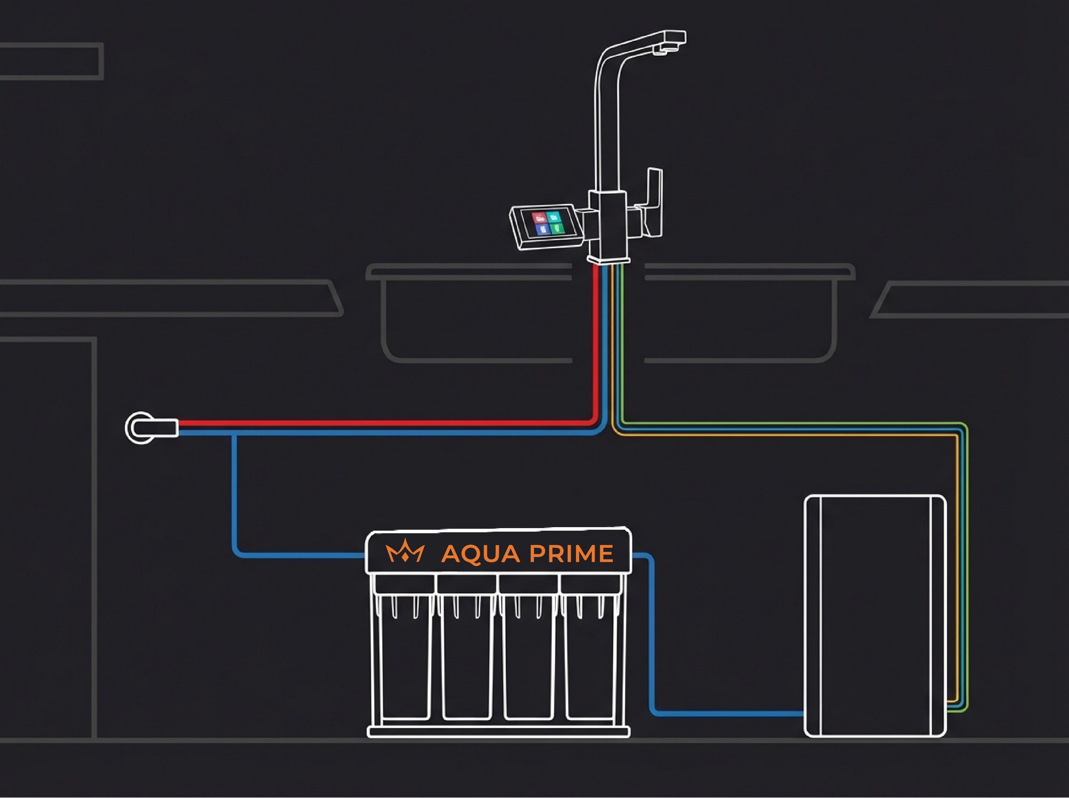 Система подключается к уже подведенным под раковину трубам, электросети и канализации (для дренажа фильтра). Никаких дополнительных отверстий не требуется