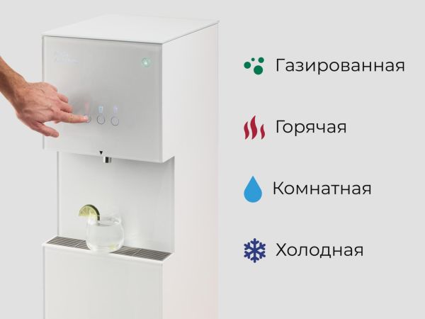 Сенсорное нажатие полностью исключает контакт стакана с рабочей поверхностью. А высокая зона раздачи, позволит легко и удобно набрать чистой воды в любой чайник или графин.