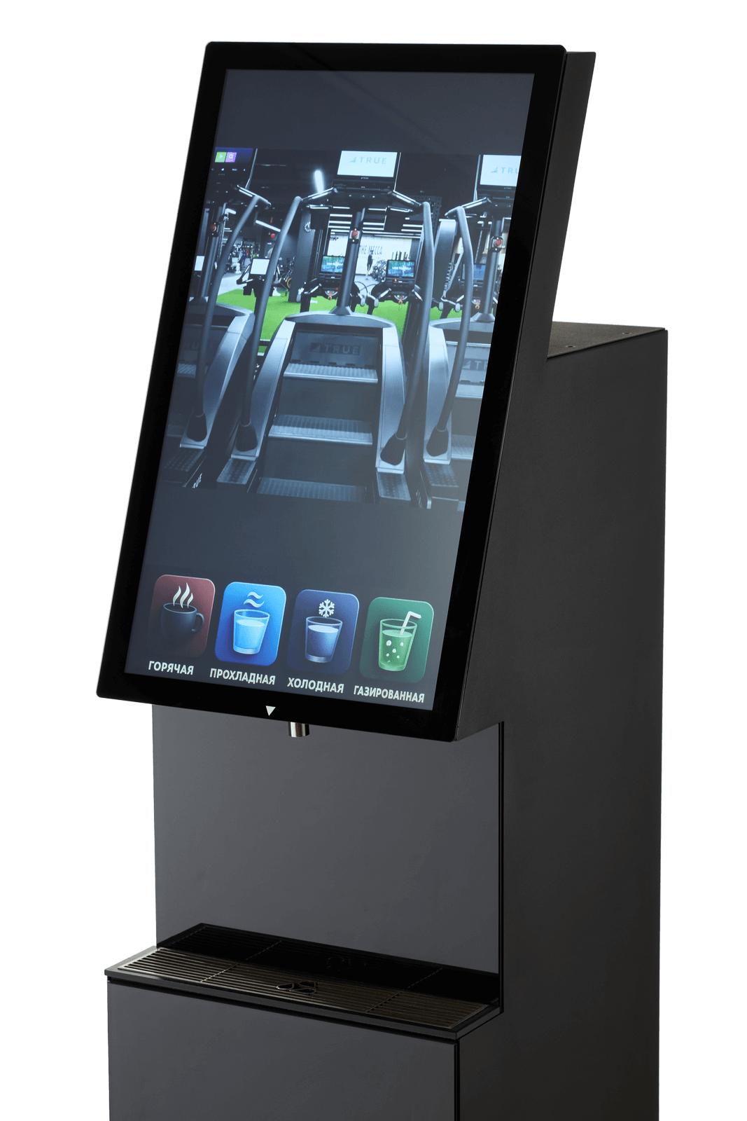 На экране отображаются чёткие иконки с подписями: горячая, прохладная, холодная и газированная вода.